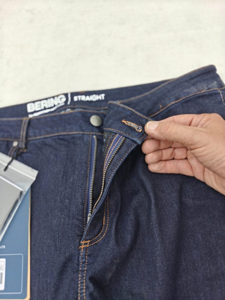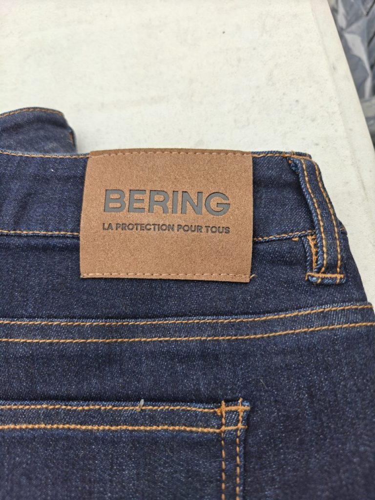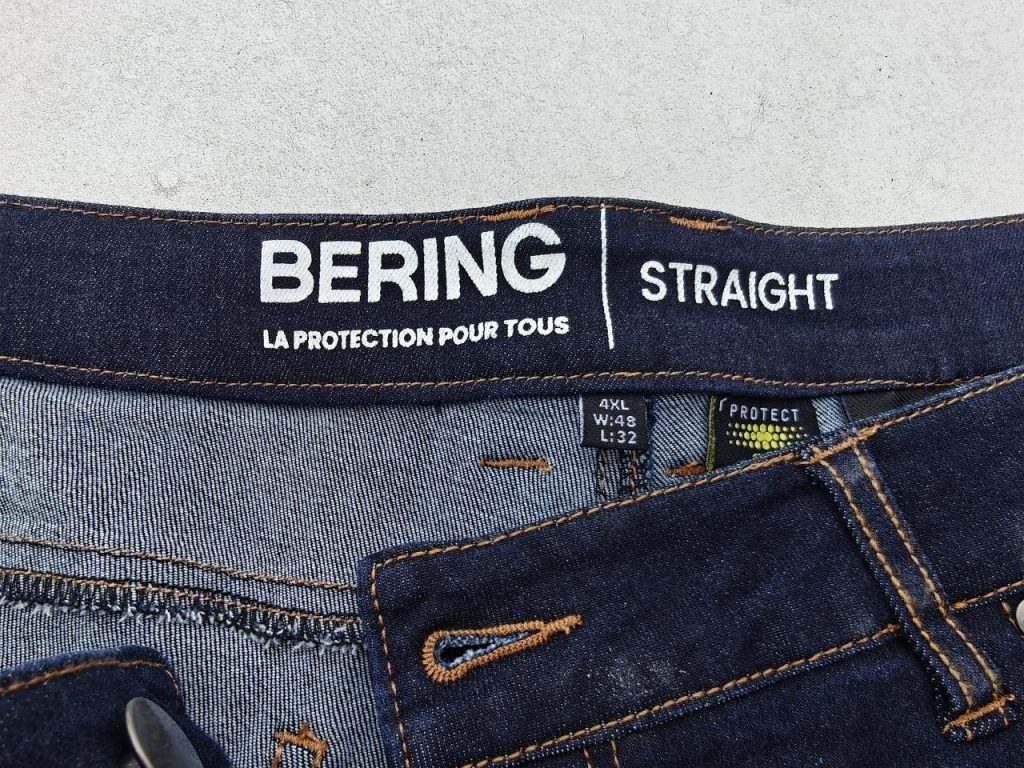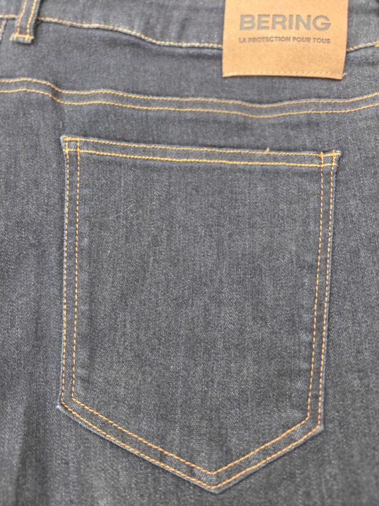 Notre jeans Bering Trust d’essai est en finition brute. Le denim est de couleur bleu foncée et pour les amateurs, sachez qu’il existe aussi en version délavée. Le design de ce jeans est soigné, la finition est exemplaire avec les 5 poches dont la fameuse poche à Zippo® sur l’avant et les pattes pour placer la ceinture. La fermeture se fait par une tirette métallique et un bouton de la même matière. Sachez que ce jeans Bering Trust va vieillir et se patiner tout autant qu’un jeans classique avec le temps et le coloris choisi lors de l’achat pourra donc se modifier à l’usage. Grâce au 5 poches dont il est doté, ce jeans Bering Trust emportera vos affaires quotidiennes. Tout autant que nos jeans classiques, ce dernier a emporté facilement notre porte-carte, notre badge d’accès professionnel, notre canif préféré, notre petit porte-bonheur ainsi que notre lampe de poche. Les poches arrières sont assez profondes pour accueillir notre smartphone lorsque nous ne sommes pas sur la moto.