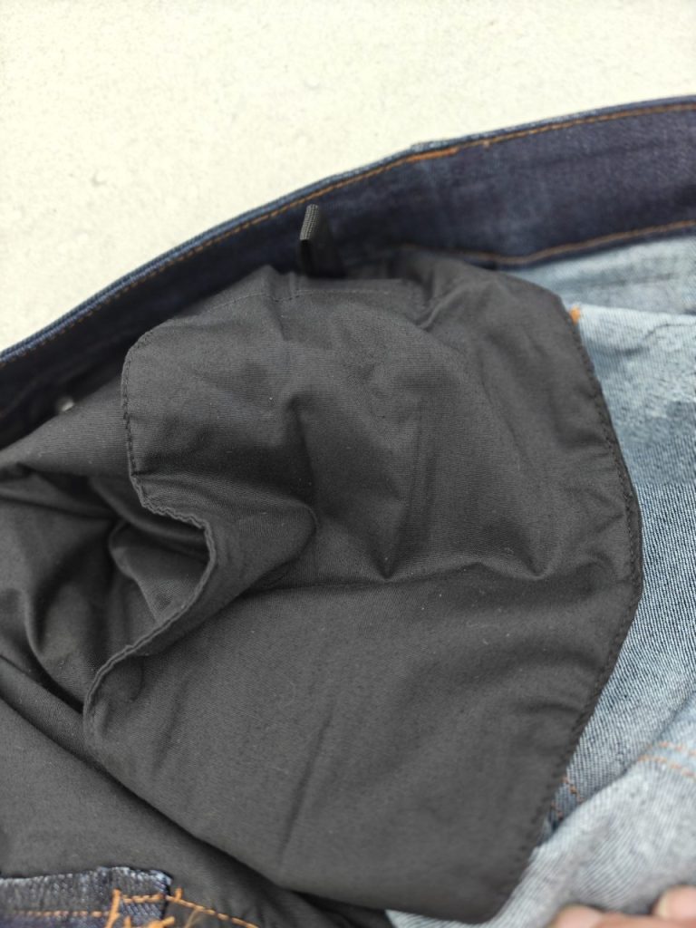 Les protections de genoux intégrés se font oublier dès le départ. Le seul bémol à notre avis et je compare le jeans Trust avec mon autre Bering, c’est que les protections de genoux amovibles ne le sont que si vous descendez votre pantalon et accédez à ces dernières par le côté interne du pantalon. Sur mon Bering Randall, des tirettes discrètement intégrées sur les coutures des genoux coté extérieur du jeans, permettent d’enlever ces dernières en quelques secondes sans devoir retirer le pantalon. Ce qui est facilement faisable en étant descendu de sa moto, je le faisais régulièrement et plaçais mes protections de genoux dans mon Top Case avec mon casque et mes gants. Ce n’est pas un défaut mais cela est quand même un retour en arrière au niveau de l’ergonomie.