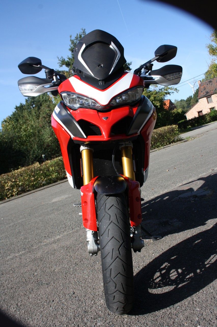 La dotation en pneus est fournie par la maison Pirelli au travers de ses Scorpion Trail 2, de la vraie glue. Au vu de la puissance à faire passer au sol et de la conduite adoptée pendant notre essai, il faut avouer que je ne donnais pas cher de leur peau à ces Pirelli’s… Que nenni, ils ont assuré et même si quelques légères amorces de glissade de l’arrière sont apparues en sortie de courbe sur une relance vigoureuse (et c’est peu dire), ils sont restés très prévenants et ont fait preuve d’endurance sur la semaine d’essai. Il ne faudra pas hésiter à chausser votre Multistrada à l’identique lorsque le moment douloureux du remplacement sera venu. Il va falloir un sacré budget au vu des capacités de la 1260, elle risque de manger de la gomme aussi vite qu’Obélix avale un sanglier.