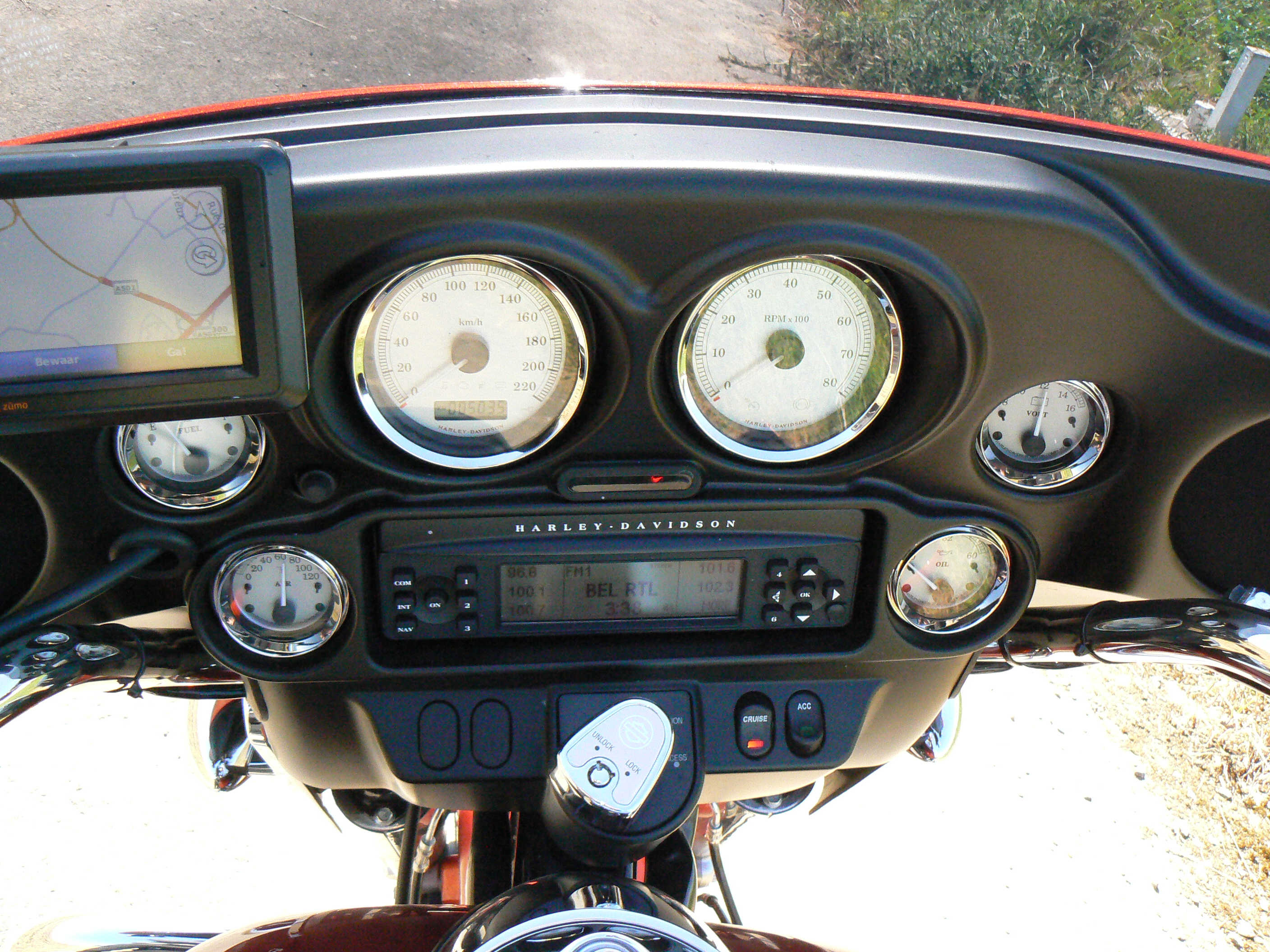 Le Garmin se clipse facilement, plus besoin de sortir le tournevis comme pour le Zumo 550 et son design sobre colle bien avec celui du tableau de bord. Comme il est branché sur la moto, pas de souci non plus d’autonomie de batterie.Les quelques jours de promenade ne nous ont pas permis de tester toutes les possibilités de ce GPS mais à première vue, il semble être une nette évolution du 550 qui était déjà pensé pour la moto.Profitez donc de votre Street Glide, pas trop bruyante si ce n’est à cause du vent dans le casque, une sonorité virile mais supportable et les vibrations dues au twin sont bien maî.trisées.L’Abs et le freinage sont à la hauteur même en cas d’urgence, la moto reste stable et on peut franchement tirer sur le levier sans hésitation.