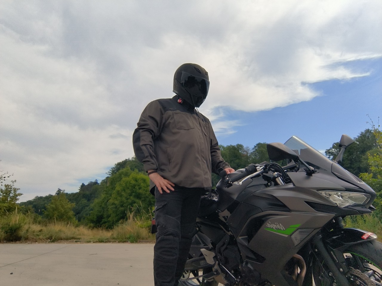 Inutile de vous dire que ce blouson est super léger, ça nous change de certaines vestes touring. On l’enfile comme une chemise, sous le rabat fermé par pression le grand zip vous facilite la vie, on ne ferma quasiment plus les pressions d’ailleurs. Deux poches sur le haut et deux sur le bas, fermées par zip. Pas de réglages à la taille ni sur les bras mais deux zips quand même pour le confort. Un bon point en plus, comme elle a un col comme une vrai chemise, les pointes sont fixées par pression, ce qui évite leur évite de frapper dans le casque dès qu’on roule.