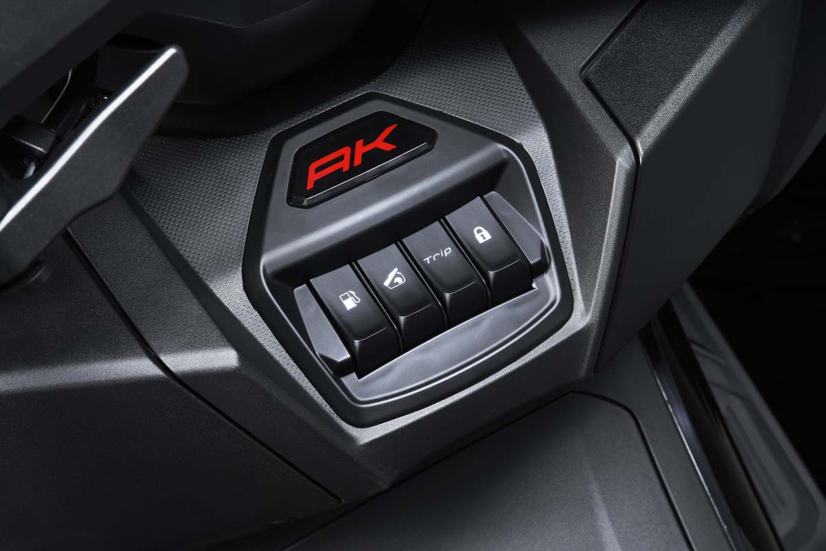 La molette éclairée de l’ancien AK fait place à un mini-clavier d’où l’on peut notamment déverrouiller la sellerie et la trappe à essence. La soute éclairée et capitonnée est pratique, mais on a déjà vu de plus grands volumes de stockage; disons que l’AK Premium fait l’essentiel en ce sens qu’on y rangera son casque et quelques affaires.