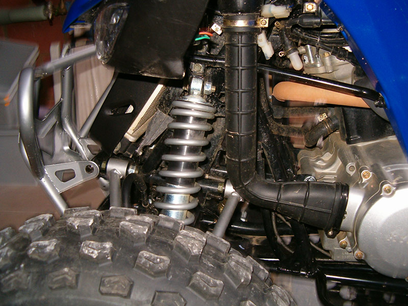Coté technique, c’est un bloc 4 – temps qui gagne 22cc, pour 271 contre 249 auparavant, refroidi par liquide, son radiateur est placé fort bas et protègé par un simple grillage. Muni d’un choke, il a pourtant du mal à garder son ralenti à froid. Pas de changement de vitesses, mais un variateur, ce qui donne l’impression d’une conduite moins nerveuse, tout en ayant un démarrage surprenant de vigueur qui met facilement en wheeling les 191kg de l’objet.La vitesse de croisière sur ce Maxxer ne dépasse pas la barre des 80 Km/h, ce qui est honorable pour une petite cylindrée. On note quelques vibrations un peu perturbantes et une marche arrière un peu trop brutale à notre goû.t. Ce Maxxer est néanmoins très agréable à utiliser en ville, grâce à une tenue de route irréprochable avec, pour suspensions avant, deux amortisseurs réglables en précharge à double triangle et, pour l’arrière, un amortisseur mono, réglable aussi en précontrainte.Lors de l’essai, les amortisseurs avant étaient réglés au milieu de leur capacité et sur route le Maxxer permet une conduite plutôt efficace grâce entre autres à des bras avant assez courts, et à une selle assez haute pour se pencher facilement dans un virage serré. Par contre, en off road, les suspensions sont trop dures pour permettre de rouler à un rythme soutenu. A vous de trouver le bon réglage pour votre utilisation, sinon il y a possibilité d’avoir des suspensions sport en option pour environ 900 €. Vous pourrez remarquer qu’on n’a pas la possibilité de faire un graissage des charnières, car c’est une matière synthétique qui est utilisée. Cela risque de rendre la conduite moins directe avec le temps… A surveiller !Pour un freinage excellent et stable en situation d’urgence, on a droit pour l’avant à deux disques hydrauliques perforés de 180 mm et, à l’arrière, à un grand disque hydraulique perforé de 220 mm. Un problème est survenu lorsque nous avons voulu sécuriser le quad avec le bloque-disque Vector, car les trous des frettes du disque sont trop petits. Conseil : utilisez plutôt un gros cadenas et un câble Vector de 1,5 m faciles à caser sur le porte-bagages. Ce modèle est équipé de jantes en alu de 10″ à l’avant, montées en pneus Kenda Claw 21 x 7, et de 9″ à l’arrière toujours en Kenda Claw de 20 x 11. Ces pneus d’une très bonne qualité s’agrippent à tous les terrain gras ou boueux, ainsi que sur route.