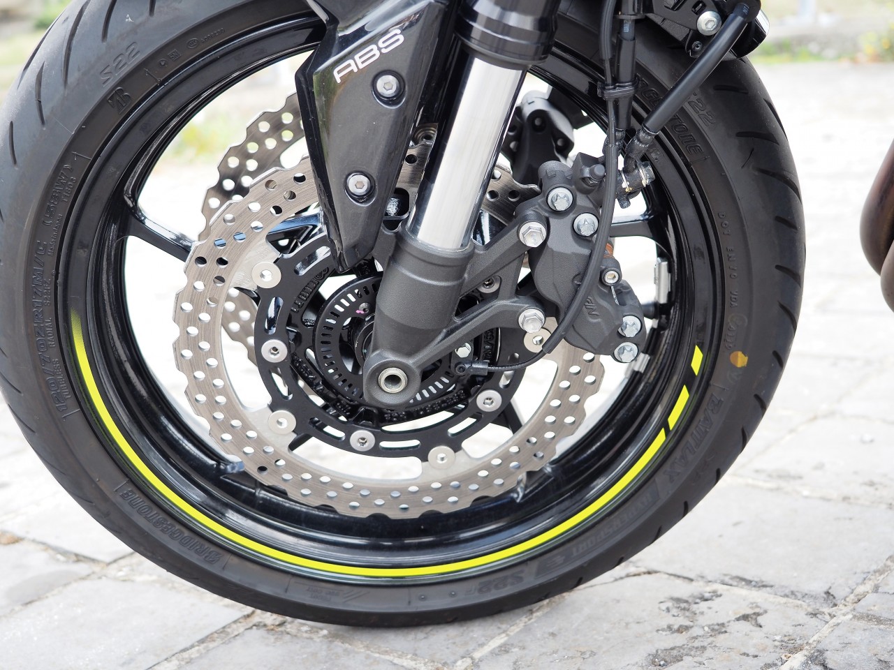La monte pneumatique de la Z900 est maintenant confiée à des Dunlop Sportmax Roadsport 2 mais sur notre moto d’essai, comme vous pouvez le voir sur notre moto, on retrouve des S22R signés Bridgestone. Ne me demandez pas pourquoi ! La demande ne vient pas de nous.