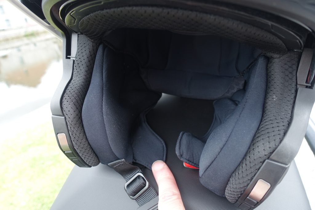 Je n’ai pas le système intercom qui est disponible en version X-COM 3 et Pro mais ça ne m’empêchera pas de parler de l’insonorisation. Ca semble être un point qui devient de plus en plus important pour les fabricants (enfin certains). Quand on enfile ce X-Lifetour, la première chose qui marque, c’est le confort. Les mousses sont doux mais tiennent bien fermement autour de votre tête et vos oreilles. C’est comme mettre votre tête entre deux coussins. C’est moelleux et quitte à me répéter, c’est confort. Et ça joue aussi sur l’acoustique tout autant que l’aérodynamique de la coque. Je parle évidemment en version intégral puisqu’il est bien homologué P/J et vous pouvez l’utiliser en jet.