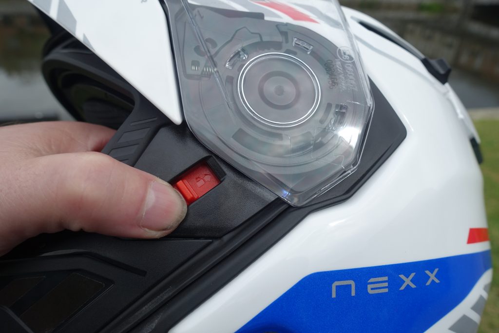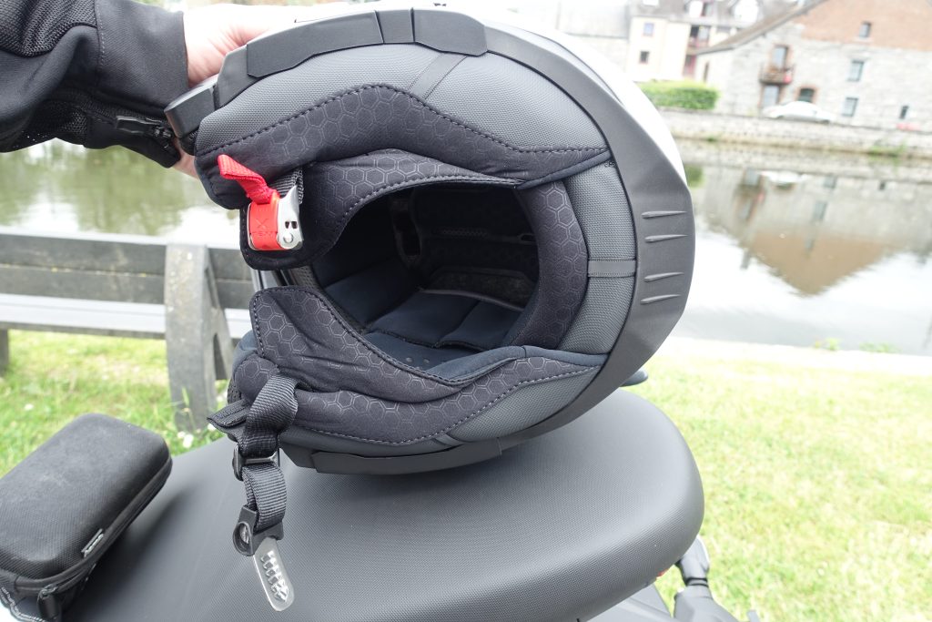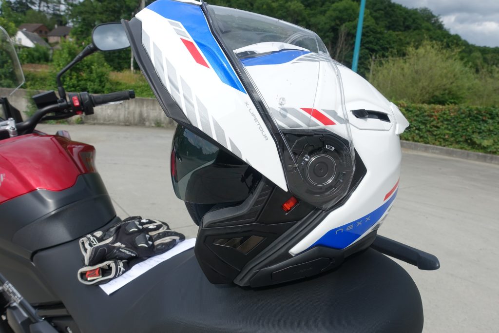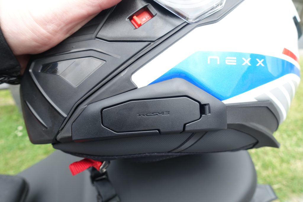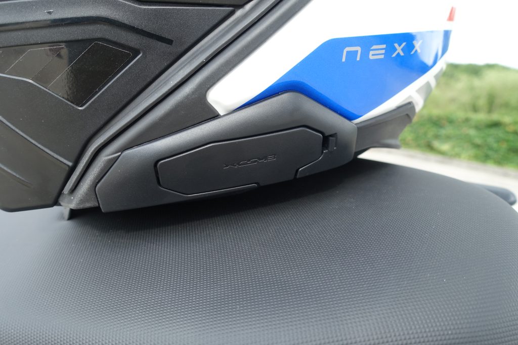 On retrouve évidement tout ce qui fait le charme d’un modulable touring : ouverture d’une main, écran solaire interne et large écran principal offrant un angle d’ouverture de 15 % plus large. On note aussi une boucle micrométrique, une extraction rapide des mousses et comme Nexx se veut résolument moderne, on a aussi droit à des supports pour caméra. Un peu dommage quand-même que ce soit des platines lisses sur lesquelles il faut coller une attache alors que sur le XWED, on a droit à la fixation type Gopro. On en va pas faire la fine bouche, ça ne se trouve pas sur beaucoup de casques et c’est super pratique quand on veut créer des vidéos.