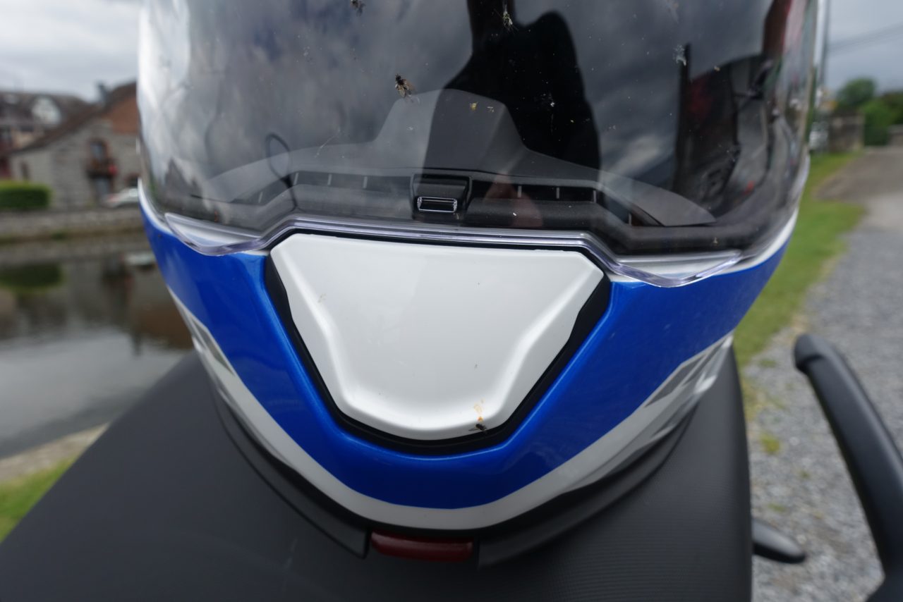 Et encore, puisque même en jet, vos oreilles restent bien à l’abri et on peut rouler avec la mentonnière relevée. Alors forcément, si vous comparez avec les 180° comme ceux qu’on vous a montré cette saison, celui-ci pivote à 90° et la prise au vent est sensible. Au delà des 80 km/h, on commence à le sentir et avec 10 de plus, on va préférer le fermer à moins d’être sur une moto avec une excellente protection. Evidemment, il faut descendre l’écran solaire, à moins de rouler avec des lunettes. Il descend juste assez pour rouler à ces vitesses mais ici aussi, en augmentant le rythme l’air va finir par passer en-dessous. La commande juste au dessus du point de pivot n’est pas la plus simple à trouver, il faudra un peu de pratique pour la choper facilement.