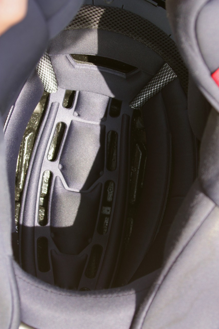 Epinglons encore le Speedview (l’écran solaire intégré qui se manipule plus facilement que par le passé) étiré vers le bas et traité antibuée. Le revêtement interne Kwikwick3 -fait de mousses 3D Contour pour le confort- gagne en douceur, et le système de changement rapide de la visière Ellip-Tec est plus intuitif, donc plus rapide que sur l’Exo-1000. Ces améliorations s’avèrent payantes à l’usage : on apprécie effectivement le confort accru de l’intérieur. Le soleil ne passe plus sous le Speedview même s’il aurait pu être plus foncé. Par contre, l’étanchéité sous forte pluie régresse, et un goutte-à-goutte pourra apparaître derrière la visière sans toutefois exposer votre visage à l’eau.