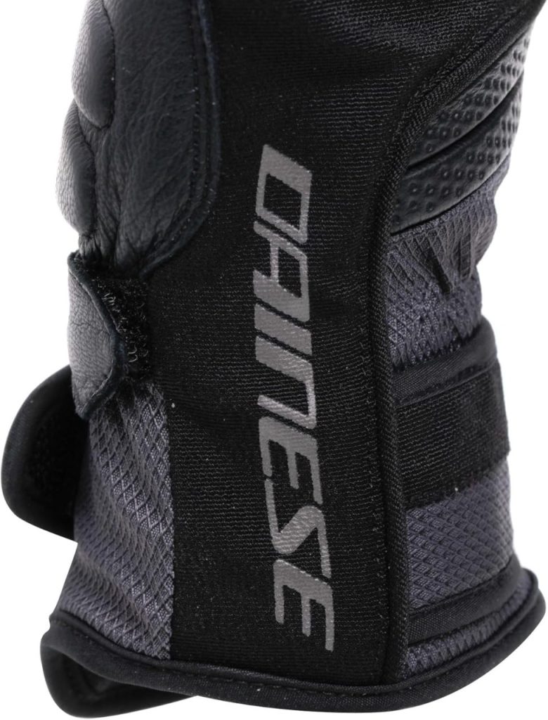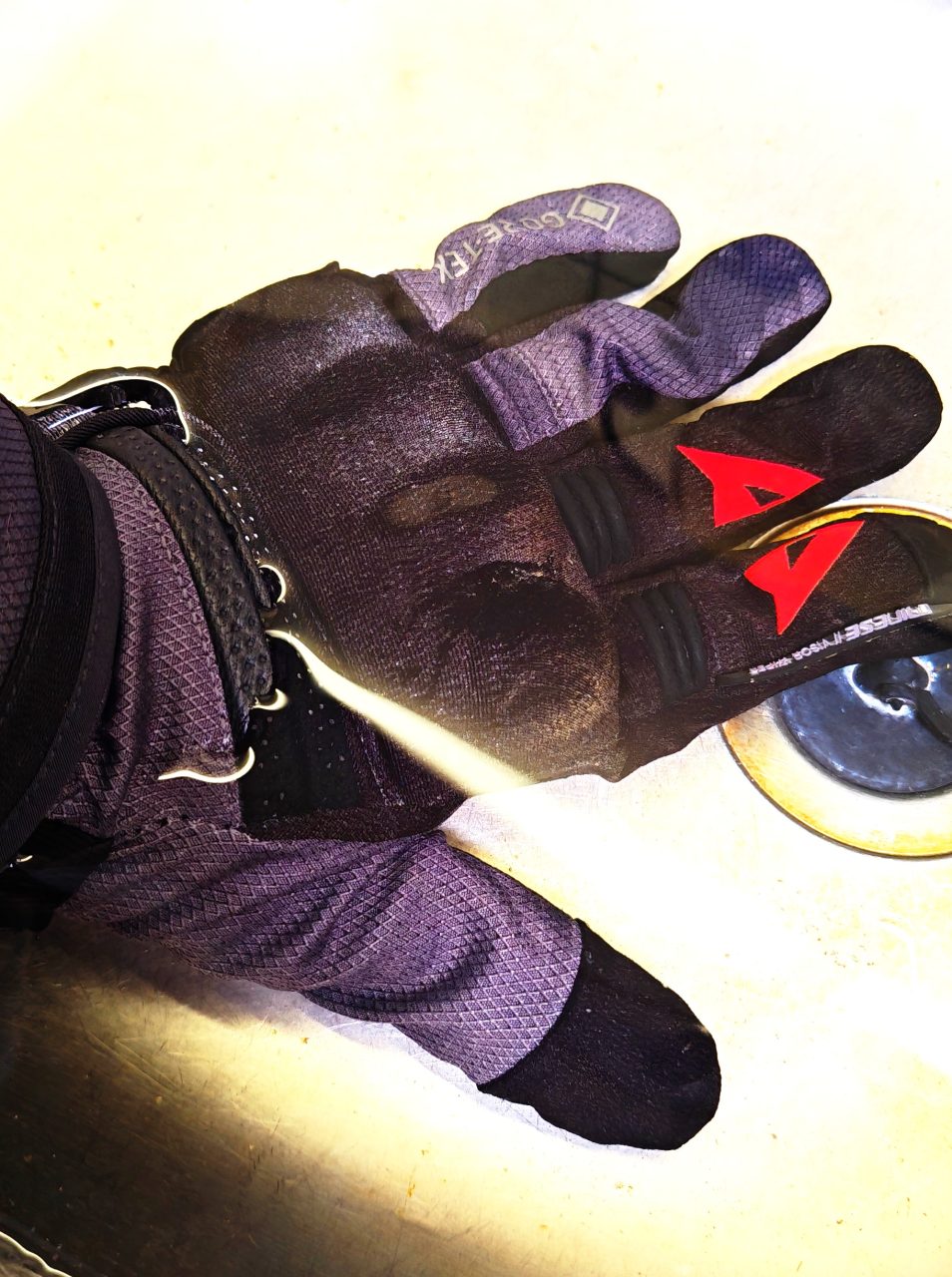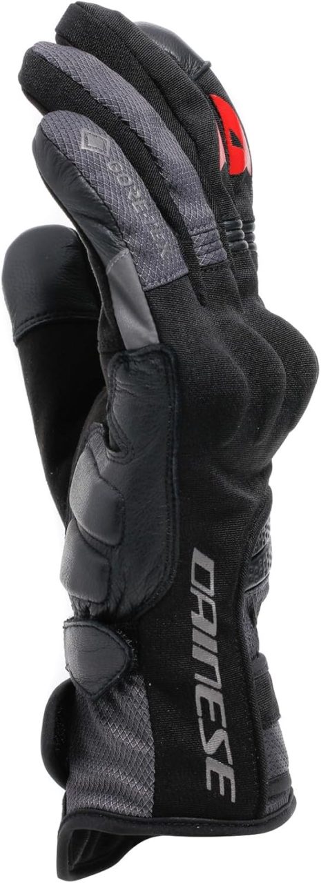 Fidèle à l’héritage de la maison, les Teyde se veulent esthétiques par leur mélange de matières (textile, suède synthétique et cuir de chèvre) et leurs différents coloris. Le logo originalement scindé sur les majeurs et index leur confère un surplus d’identité visuelle. On note d’emblée que les doigts sont préformés pour la préhension d’un guidon et que le dos de la main intègre des coques Pro-Tek, tandis que la paume est nantie d’ « amortisseurs » supplémentaires pour limiter l’impact lors d’une chute. Les pouces et les index disposent d’une surcouche tactile tandis que l’index gauche est pourvu d’une raclette toujours utile comme « essuie-glace ». Soulignons, pour terminer le tour du propriétaire, que c’est la dernière génération de membrane étanche qui équipe les Teyde, dénommée Gore-Tex ePE. Il ne s’agit pas ici du Gore-tex Pro laminé en surface, mais d’une membrane classiquement intégrée au gant ; qu’à cela ne tienne, « ePE » signifie que la membrane est dépourvue de PFAS (les fameux « polluants éternels ») et qu’elle atteint le plus haut niveau de respirabilité. Encore un détail : lorsqu’un produit estampillé Gore-Tex présente la petite étiquette noire en forme de losange spécifiant « Guaranteed to keep you dry », les caractéristiques d’étanchéité et de respirabilité du produit vous sont garanties à vie. Les Teyde sont de ceux-là et, hors membrane, ils sont garantis deux ans par Dainese.
