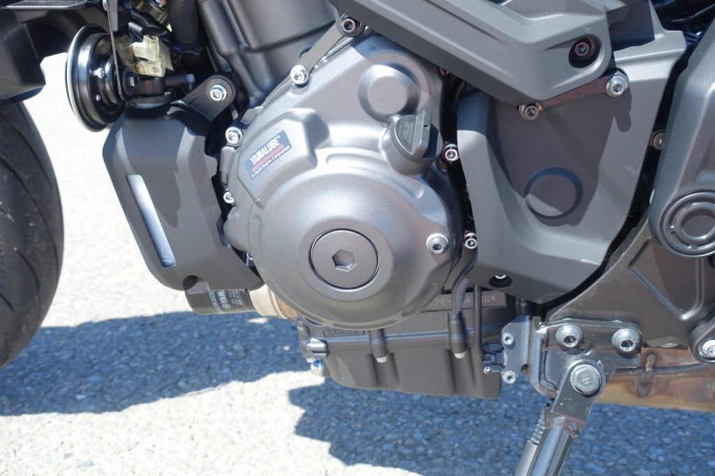 Il ne faudrait pas croire qu’elle n’évolue que sur son look même si son phare avant risque d’avoir des avis assez clivant : on aime ou on n’aime pas mais pour le reste, en bon roadster, elle se limite en carénage avec juste une petite coque arrière qui intègre la selle passager et c’est presque tout. Le moteur bien en évidence, son petit silencieux débouchant juste au début du bras oscillant, la MT-07 n’en fait pas de trop et on en n’attend pas plus.