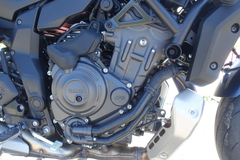 En tout cas, cette Y-Amt sied assez bien au CP2 puisque c’est bien lui qu’on retrouve au centre de cette MT-07 avec ses 690cc qui vous offre 73,4 cv à 8750 tours/min. Rassurez-vous, c’est largement suffisant pour s’amuser et avec un poids de 186 kg avec son plein, elle reste un vrai jouet pour les grands. Enfin, grands, je ne parle pas de taille parce que la selle à à peine 805mm la rend accessible à beaucoup de pilotes, homme ou femme. Le couple de 68 NM à 6500 tours est bien là et permet de belles accélérations, accompagnée en prime du son plus que sympa de la moto et de sa fonction instrument de musique 😉
